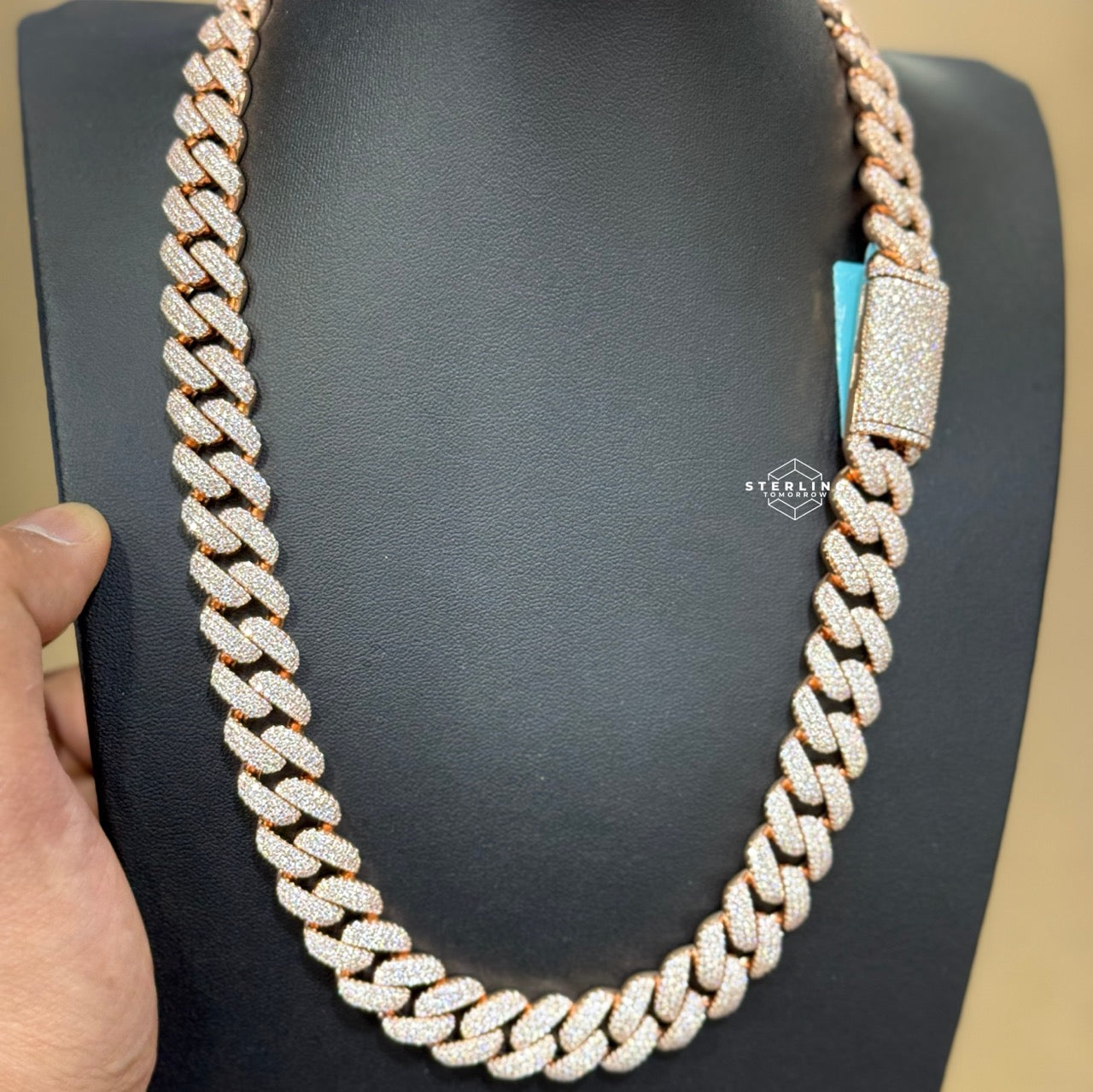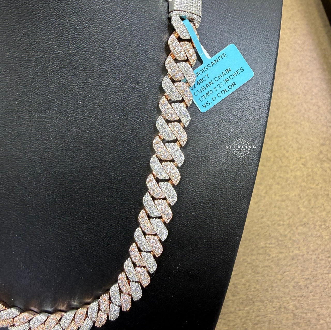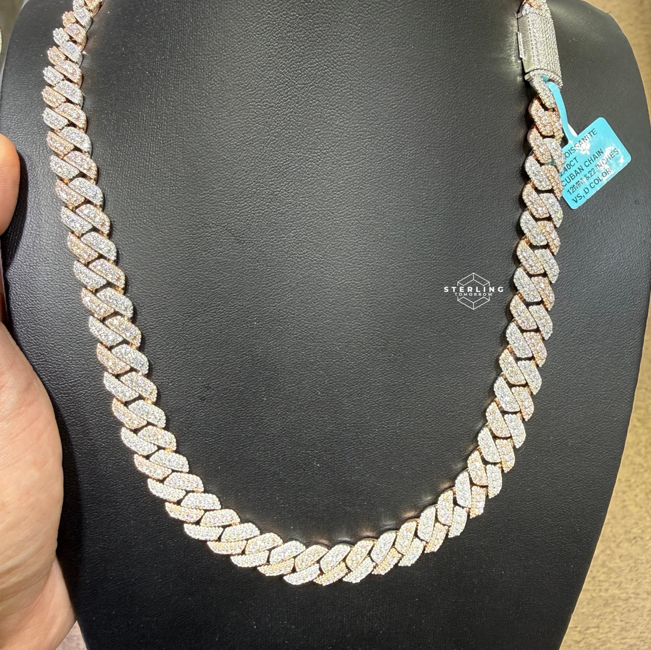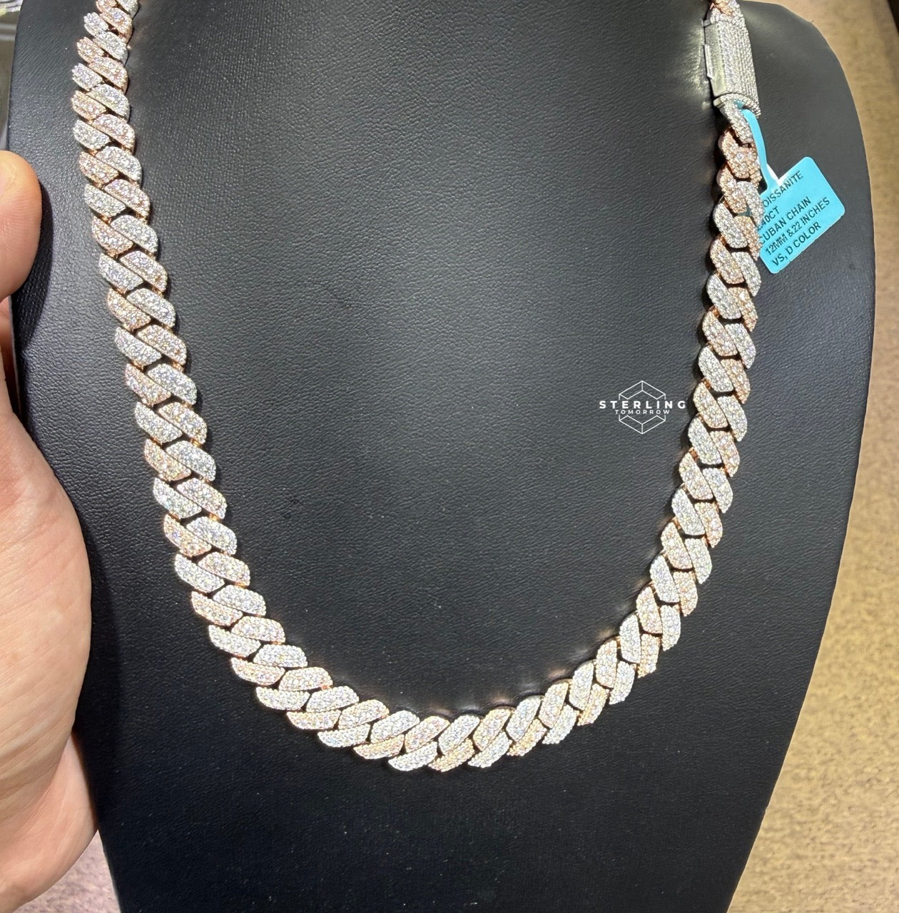 Elevate your jewelry collection with the 12mm Rose Two Tone Cuban 3D Moissanite Chain 22". Crafted from premium 925 sterling silver with a stylish rose and silver two-tone finish, this 22-inch Cuban link chain features bold 12mm links for a striking, modern look.