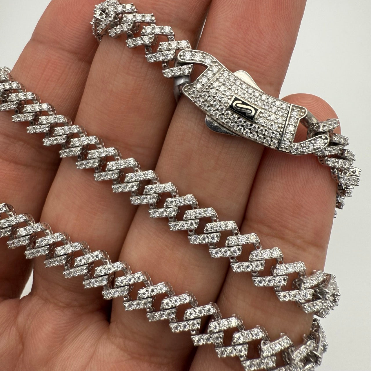 Elevate your jewelry collection with this 7mm Monaco Cuban Chain, expertly crafted from solid 925 sterling silver and set with brilliant VVS D color moissanite stones totaling 5.5 CTW. Each stone is hand-cut for maximum brilliance, ensuring an icy white sparkle that rivals natural diamonds.