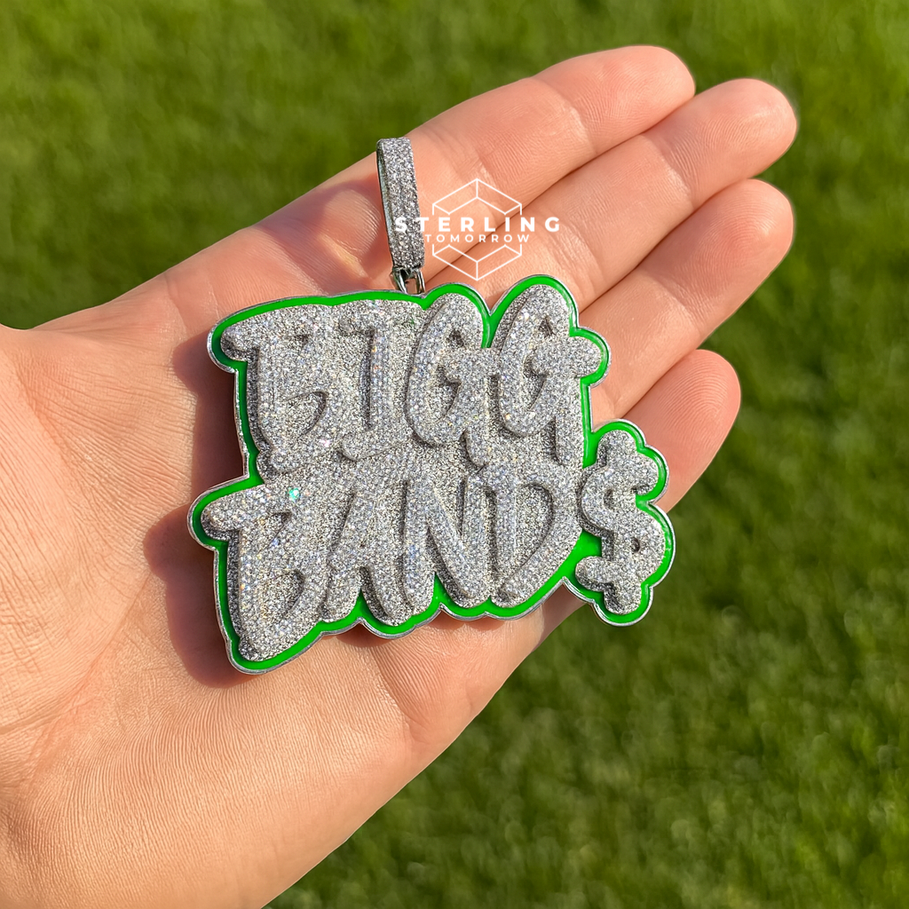 Stand out with this BIGG BAND$ custom pendant, fully iced out with handset VVS Moissanite diamonds that sparkle like natural diamonds and pass any diamond tester. Crafted in solid 925 sterling silver, this luxury hip hop pendant combines high-end shine with lasting quality β perfect for anyone who loves bold jewelry with a statement.