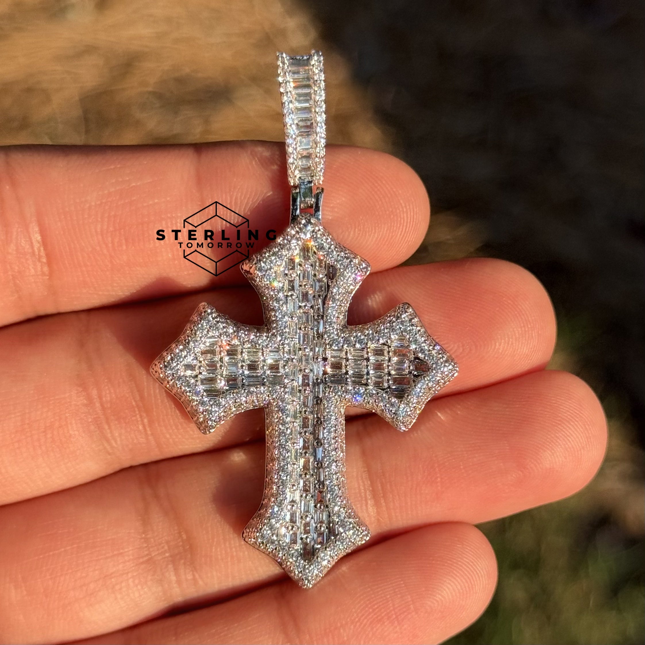 Shine bright with this stunning Iced Out Cross Pendant from Sterling Tomorrow! Crafted from durable brass and finished with luxurious 14K white gold plating, this pendant features a bold cross design fully encrusted with a mix of baguette and round-cut CZ stones for next-level brilliance.