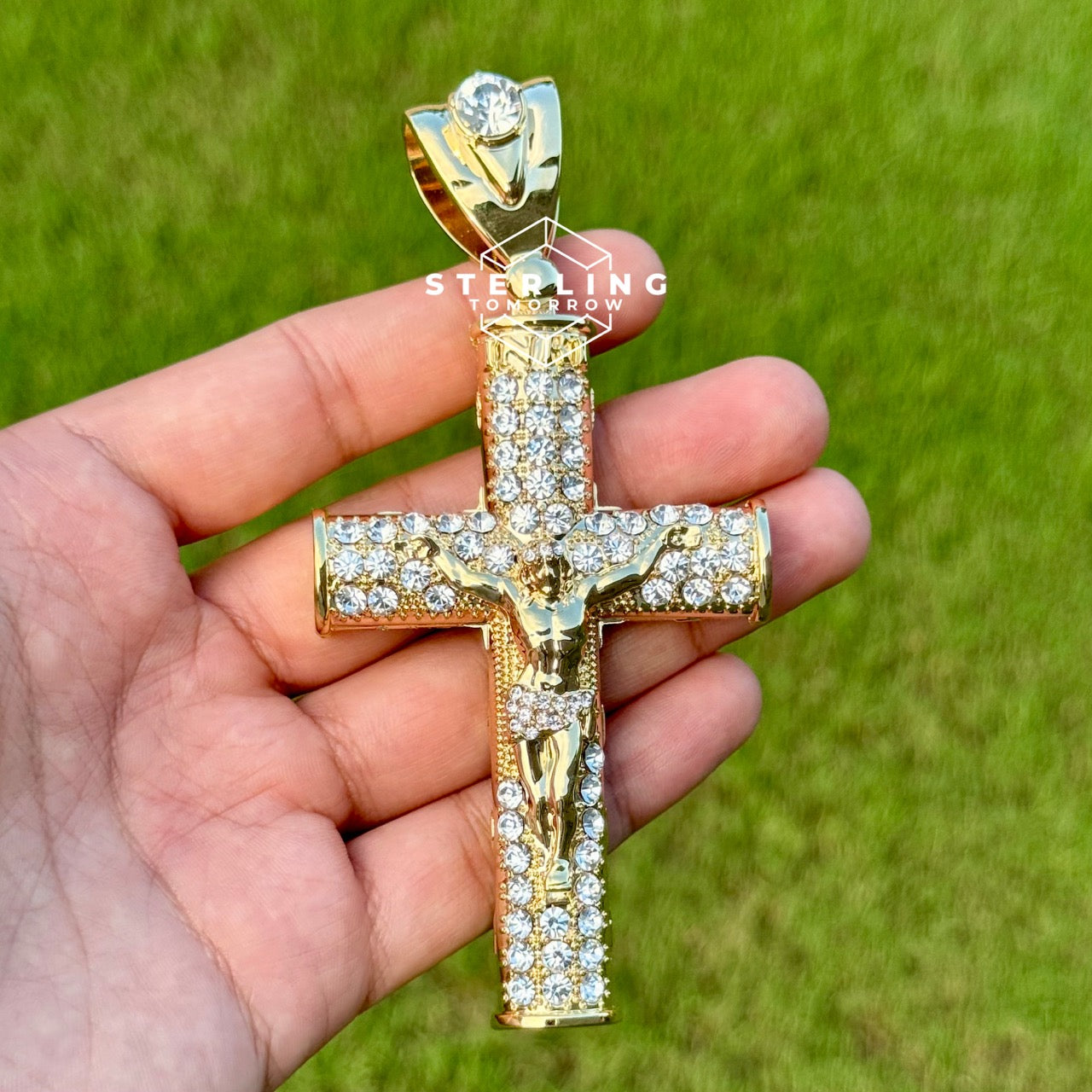 Make a statement of faith and style with this luxurious 14K gold tone finished cross pendant, showcasing a finely detailed Jesus figure and brilliant CZ diamond stone accents. Designed for a hip hop flair, it seamlessly complements your favorite Cuban link, rope, or Figaro chain. A standout piece for religious believers, it offers a perfect blend of Christian devotion and street-inspired fashion. 4.5" length including bail.Β