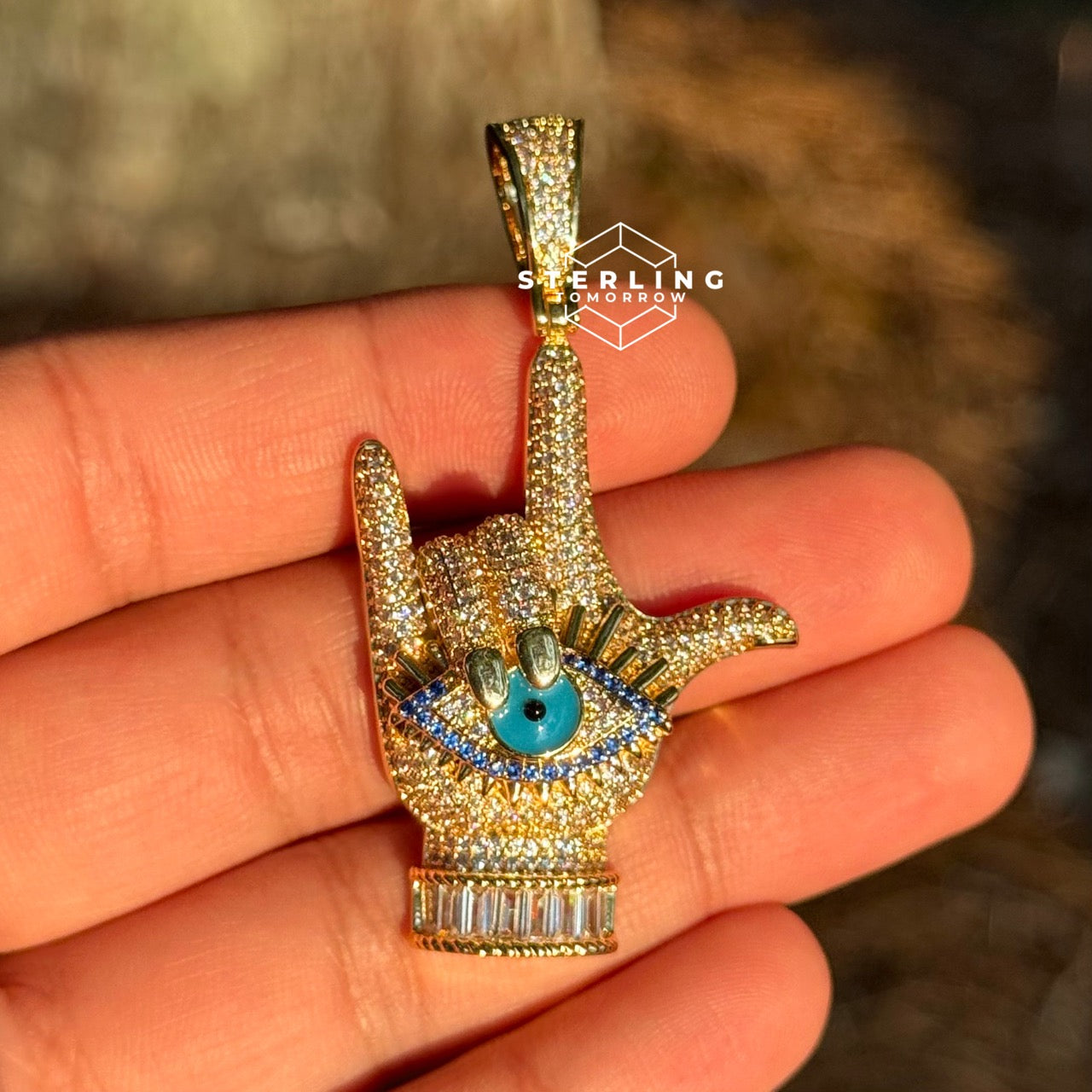 Turn up your style and your energy with this one-of-a-kind Evil Eye Hand Sign Pendant from SterlingTomorrow. Crafted in a luxurious 14K gold plated finish, this pendant features a fully iced hand in the iconic βI Love Youβ sign, paired with a bold blue Evil Eye for protection and good vibes. Encrusted with shimmering Cubic Zirconia (CZ) diamonds, it's a perfect fusion of spiritual symbolism and street-ready bling.