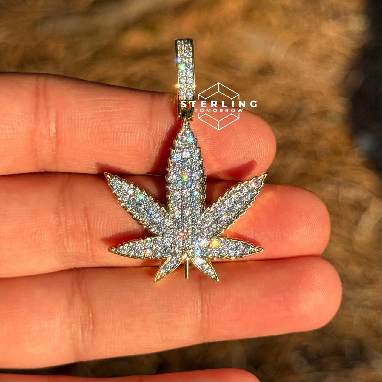 Make a bold statement with this Iced Out Marijuana Leaf Pendant from Sterling Tomorrow. Crafted in a high-shine gold-tone finish and fully encrusted with sparkling CZ stones, this weed charm necklace blends streetwear vibes with luxury style. Ideal for cannabis culture lovers, hip-hop fashion, and standout gifting.