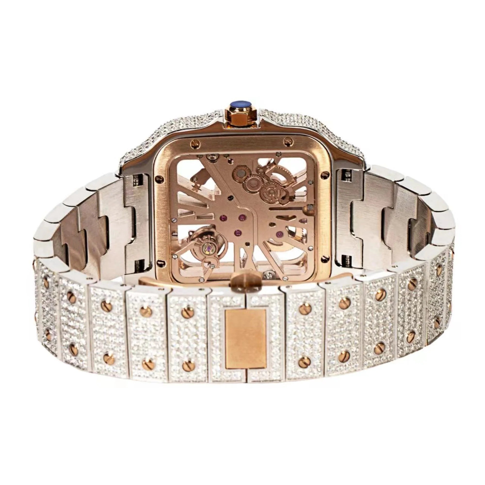 Elevate your style with the luxurious Rose Two Tone Skeleton Moissanite Watch, designed for those who appreciate elegance and precision. This exquisite timepiece features a 41mm case with a stunning skeleton dial that showcases the intricate automatic movement inside. The watch is adorned with sparkling moissanite stones that not only dazzle the eye but also pass standard diamond testers, ensuring exceptional brilliance and authenticity.